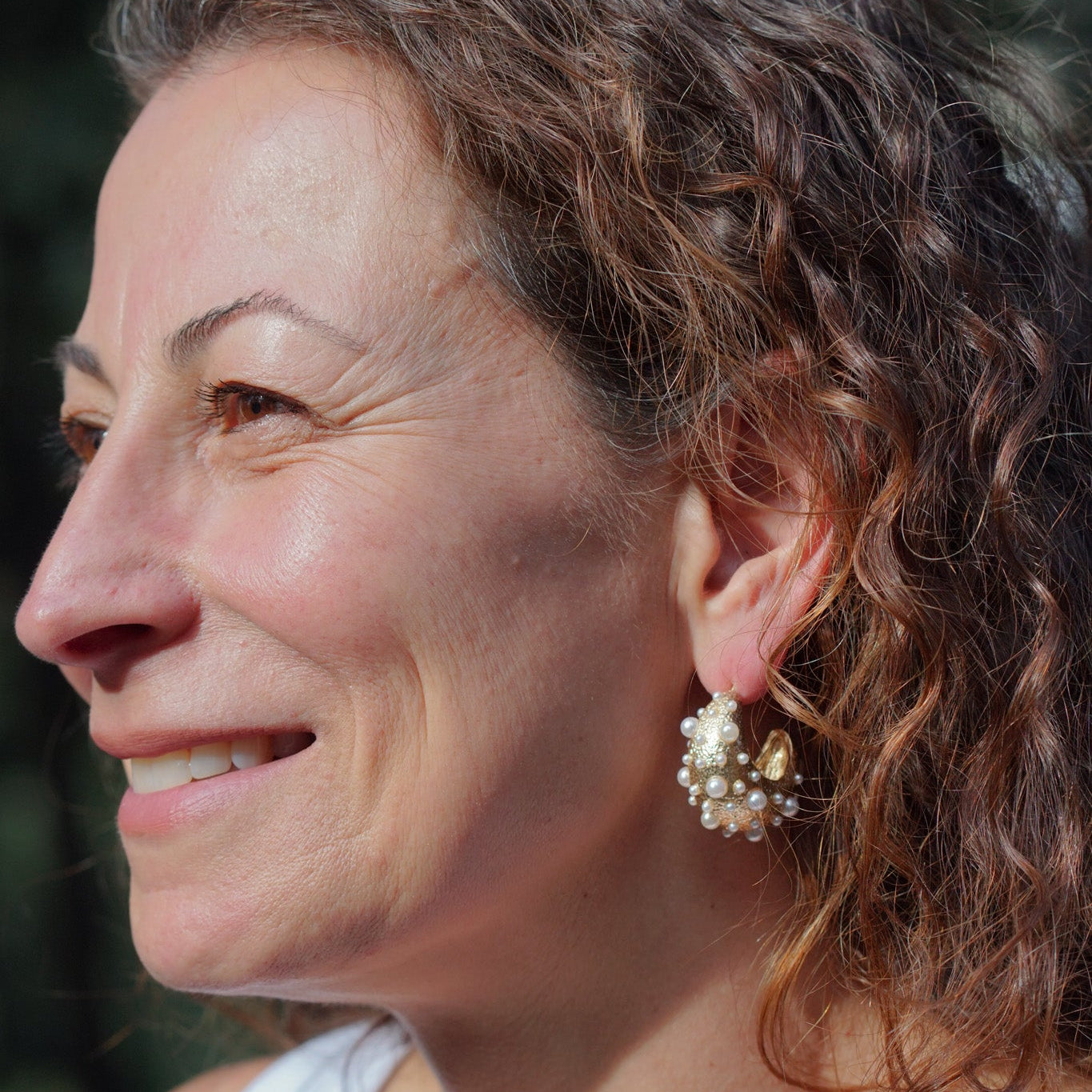 Vintage bold Gold hoops with mini pearls. Measures approximately 1.25" in length.