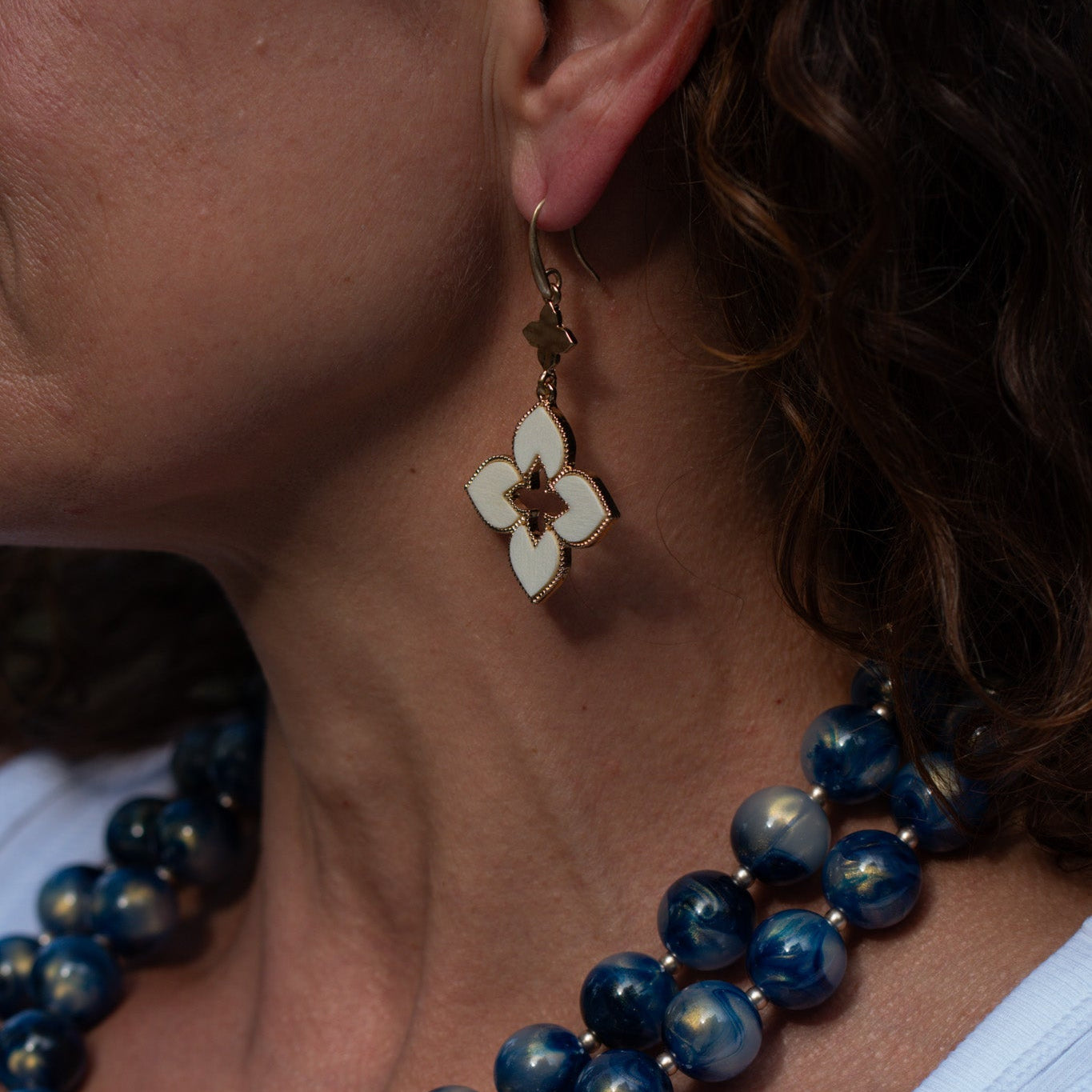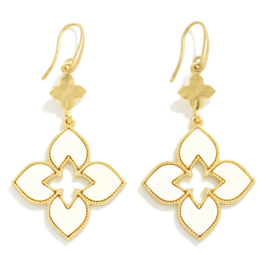These gorgeous linked clover drop earrings with a unique hammered gold trim will turn heads as you walk by. Measures 2" in length.
